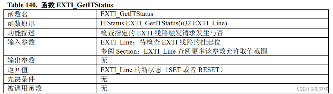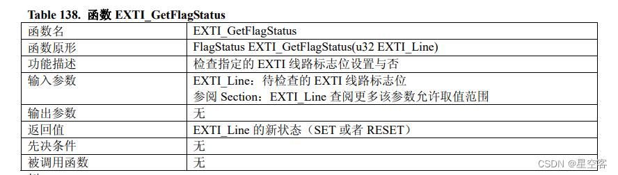 当外部中断线已经达成了触发条件,那么这个EXTI的线路标志位就会被置1,那么这个函数就可以直接获取这个线路标志位的状态。