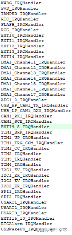 当上面都配置好了,接下来就等外部信号触发后,执行中断服务函数里的内容了,那么这里中断函数号也是有特定的名称的,你的特定通道是有对应的中断函数名的,可以在启动文件(启动文件在上一节有介绍)里面,当然这个也有固定格式,如果你只用一次中断函数,那么可以不这样写,如果要多次中断,必须在中断服务函数里面,写如果检测到中断标志位,手动清除中断标志位,代码如下。