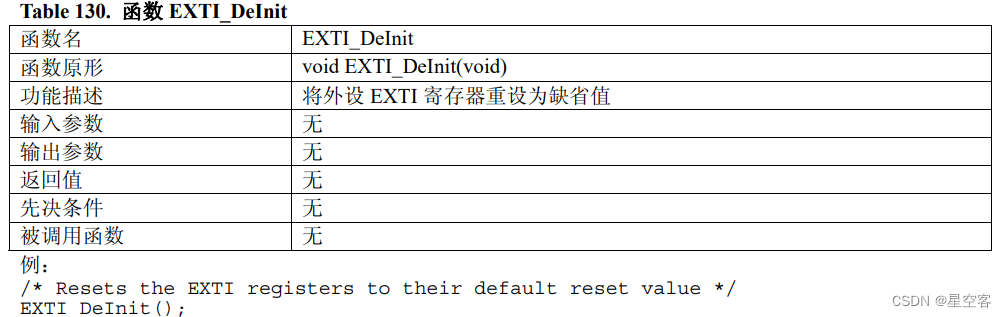这个函数说将EXTI外设的配置重新配置为缺省值,那么缺省值是什么呢,缺省值其实就是官方人员配置的默认值这个默认值呢,就是刚开始上电时的值,那么这个函数其实就是起到了一个清除配置的作用;