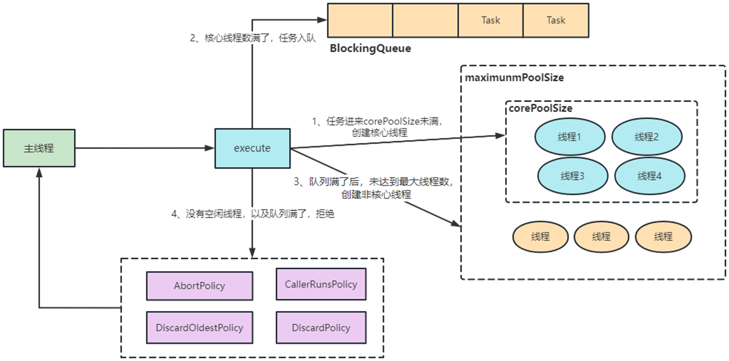3. 当阻塞队列也满了之后,那么将会继续创建(maximumPoolSize-corePoolSize)个数量的线程来执行任务,如果任务处理完成,maximumPoolSize-corePoolSize个额外创建的线程等待 keepAliveTime之后被自动销毁;