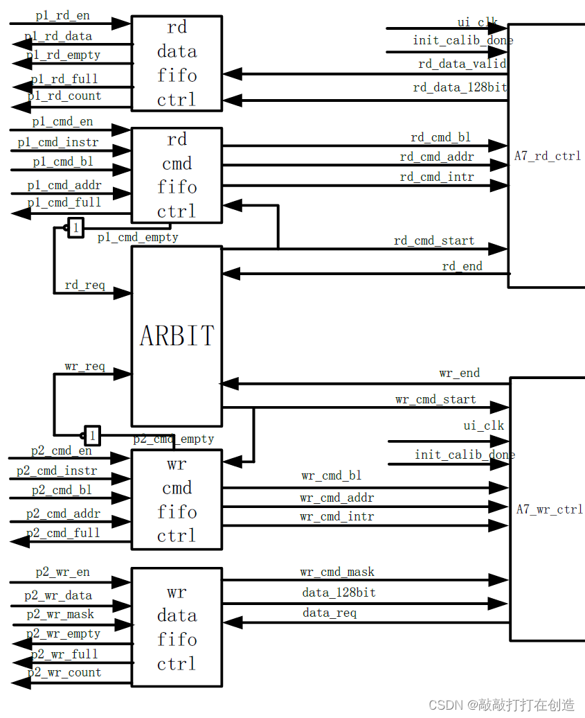 基于A7 的DDR3 SDRAM 控制器IP核的相关操作——端口优化(三) 在上一篇文章中,我们通过添加fifo解决了防止数据和命令丢失的问题。但是引入了很多的端口信号,这导致使用的时候不是很方便,所以在该篇文章中我们设计两个模块,分别是“用户写控制”和“用户读控制”模块,来减少端口信号。