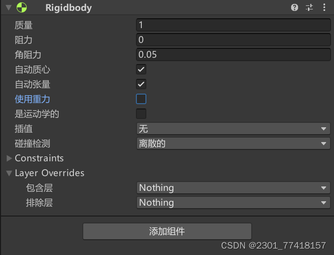 2、新建Cube,并添加上刚体和碰撞监测组件,可添加材质以方便区分。