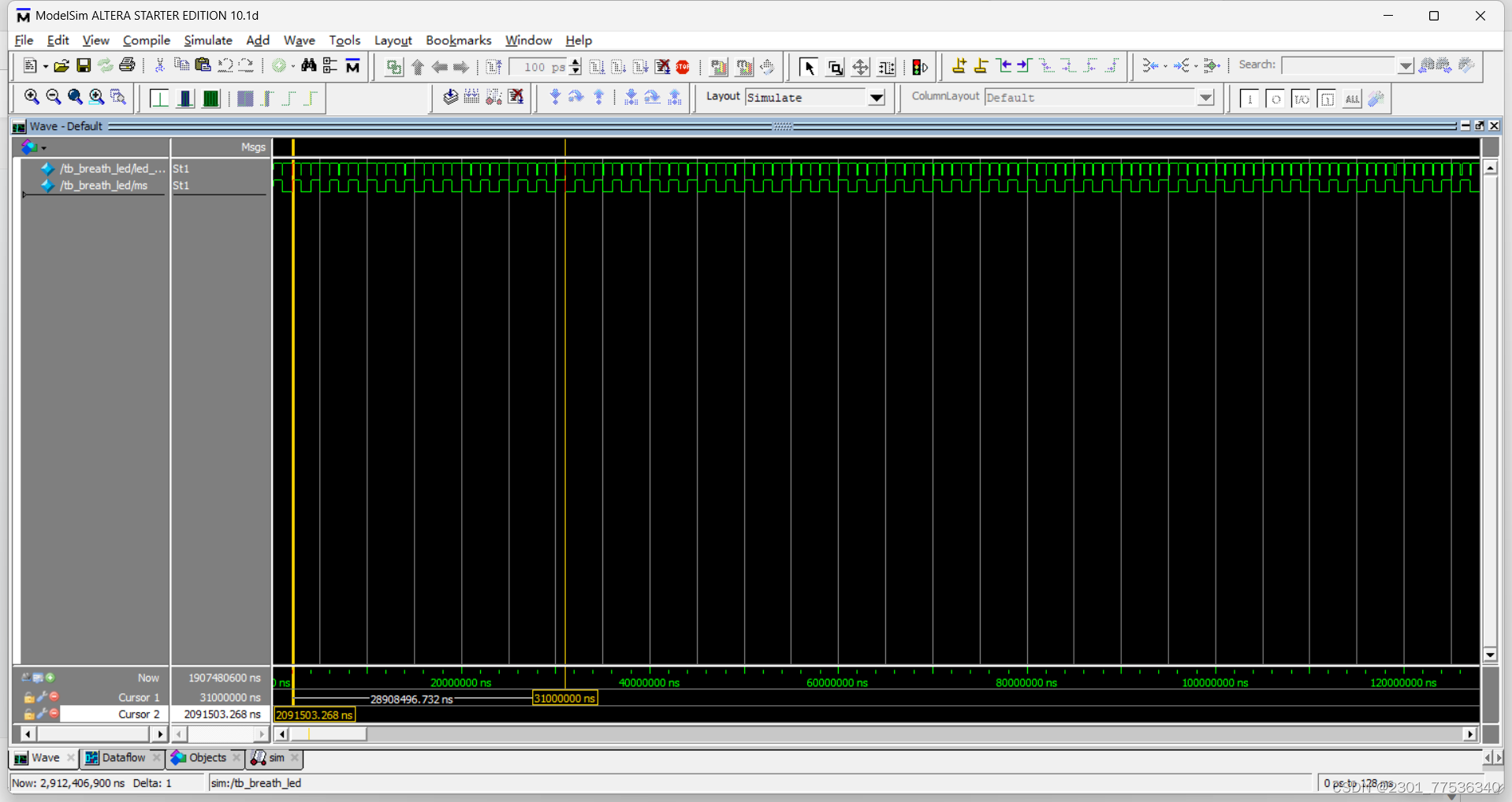 呼吸灯,1ms改变一次占空比,实现第一秒占空比从1-0,第二秒占空比从0-1