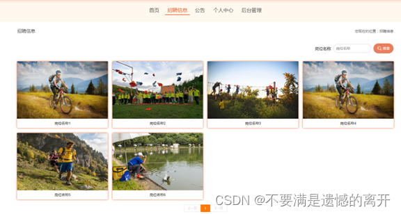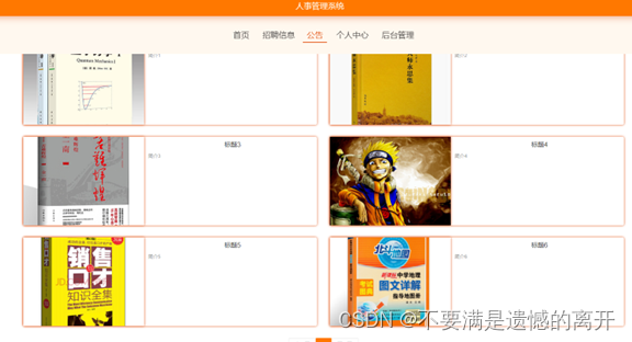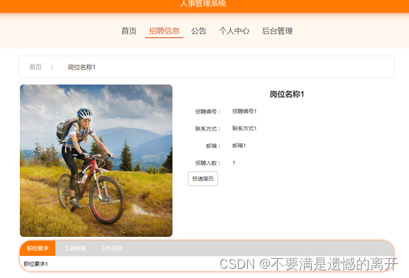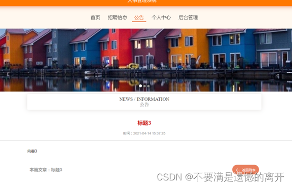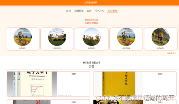 前台首页,在人事管理系统首页可以查看首页、招聘信息、系统公告、个人中心、后台管理等内容