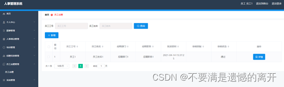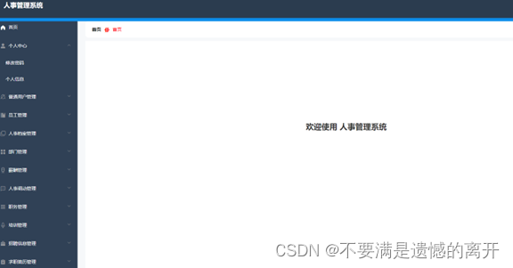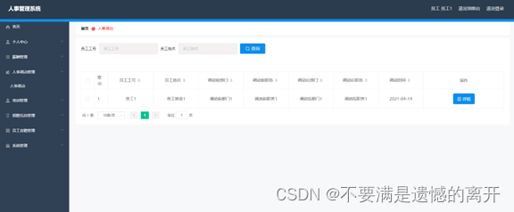员工登录进入人事管理系统可以查看首页、个人中心,薪酬管理,人事调动管理,培训管理,招聘信息管理,员工应聘管理,系统管理等内容