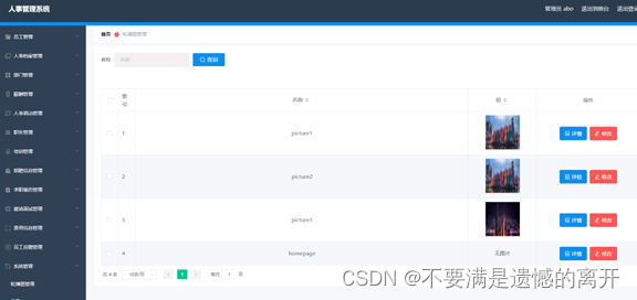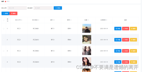 员工管理,在员工管理页面可以查看员工工号、密码、员工姓名、性别、照片、联系电话、邮箱等内容,并可根据需要进行删除,修改等操作