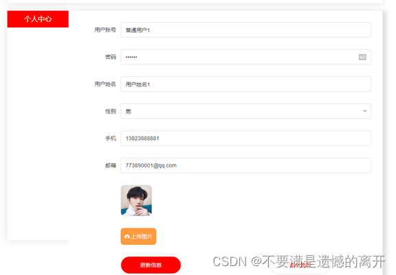 个人中心,在个人中心页面可以填写用户账号、密码、姓名、性别、照片、联系电话、邮箱等信息,根据需要对个人信息进行添加、修改、删除