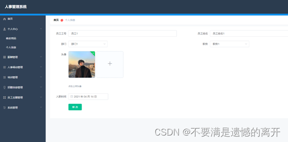 个人档案管理,在个人档案管理页面可以查看员工工号,密码,员工姓名,部门,职务,头像,入职时间等内容,并可根据需要对个人档案进行添加、修改