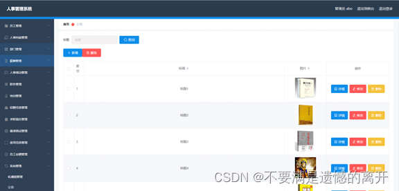 人事管理系统理工作是一种繁琐的,务求准确迅速的信息检索工作。随着计算机信息技术的飞速发展,人类进入信息时代,社会的竞争越来越激烈,人事管理系统就越显示出其不可或缺性,成为学校一个非常重要的模块。人事管理系统主要是用于对所有员工的基本资料进行录入、个人档案信息、薪酬信息、人事调动信息、职务信息、培训信息、招聘信息等等管理。使用人事管理系统便于领导更全面的掌握每个员工的基本信息。本系统以idea为开发工具,mysql作为后台数据库。主要功能权限包括管理员、员工基本信息管理模块,数据管理模块、框架管理功能模块等。本系统还设置了二中不同的用户类型,实现了二级用户权限管理体制,提高了系统的安全性以及可用行性。