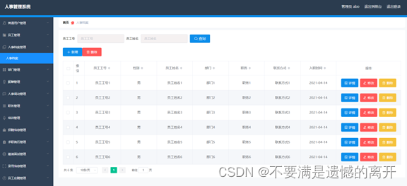 人事档案信息管理,在人事档案信息管理页面可以查看员工工号,性别,员工姓名,部门,职务,联系方式,入职时间等信息,并可根据需要进行删除,修改等操作
