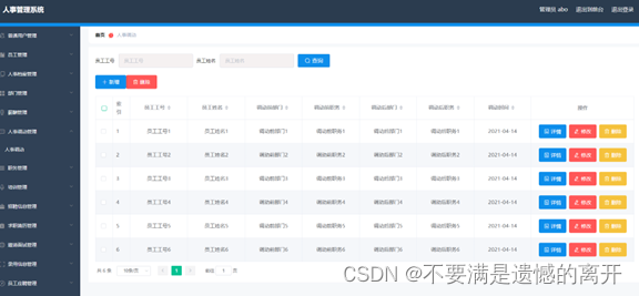 人事调动信息管理,在人事调动信息管理页面可以查看员工工号,员工姓名,调动前部门,调动前职务,调动后部门,调动后职务,调动时间等信息,并可根据需要进行删除,修改等操作