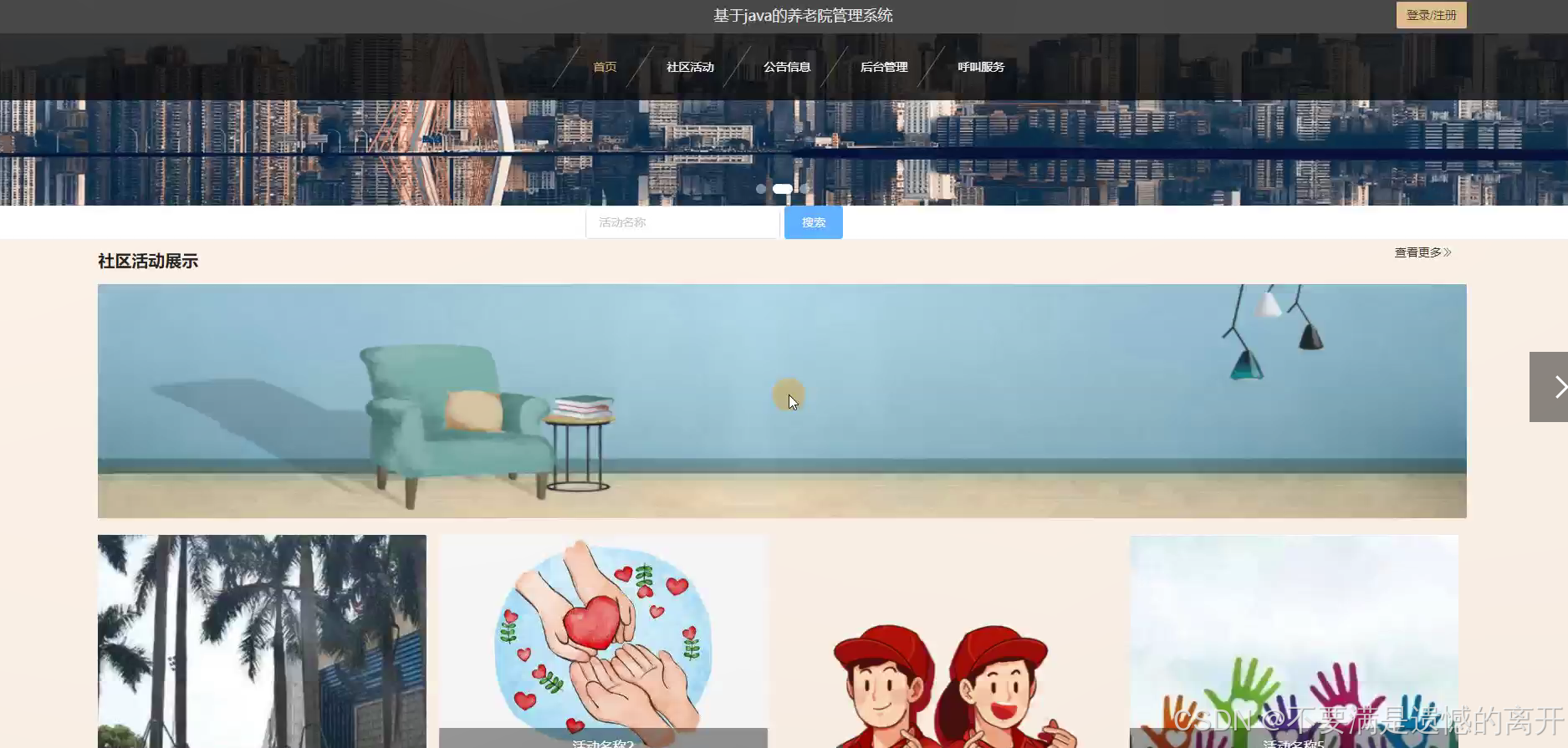 当游客打开系统的网址后,首先看到的就是首页界面。在这里,游客能够看到养老院管理系统的导航条显示首页、社区活动、公告信息、后台管理、呼叫服务。系统首页界面如图5-1所示:
