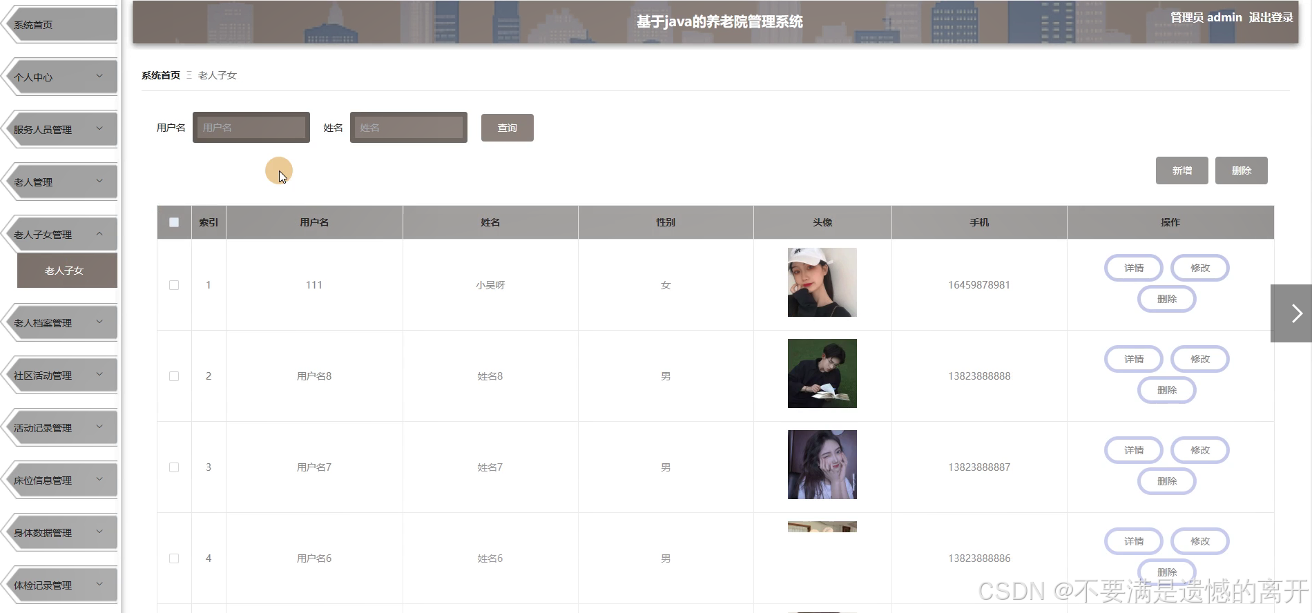 管理员点击老人子女管理,在老人子女管理页面中可以对用户名、姓名、性别、头像、手机等信息,并可根据需要进行查询、新增或者删除老人子女等操作,如图5-9所示。