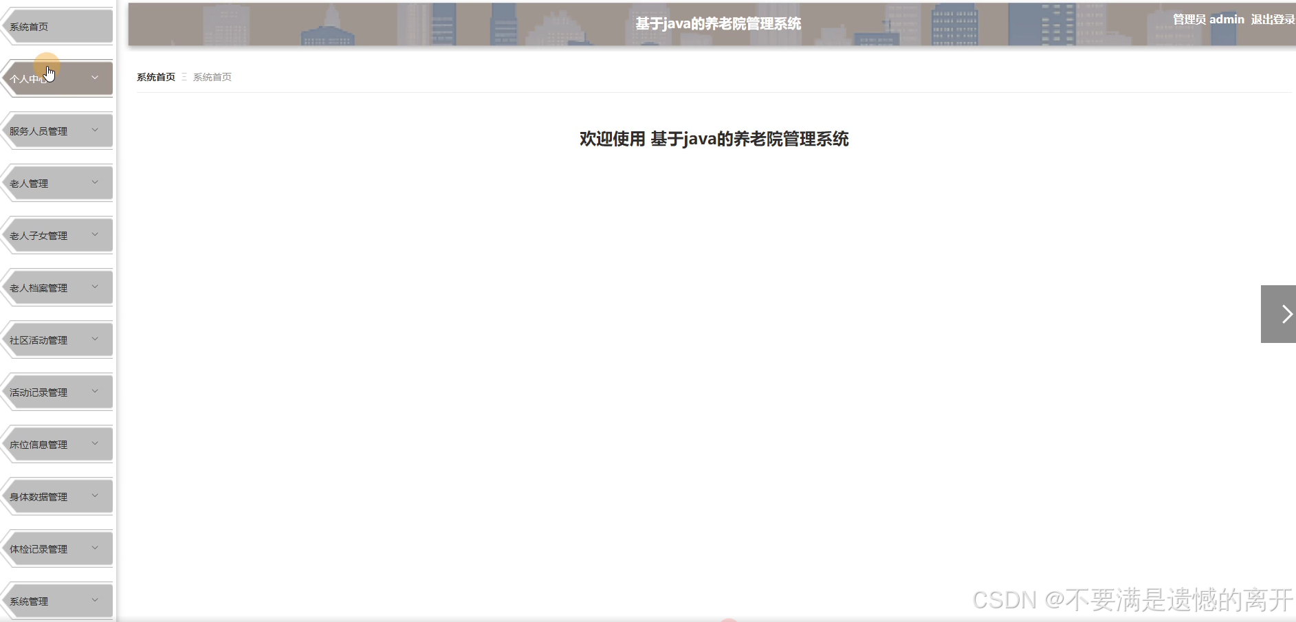 管理员登录进入养老院管理系统可以对系统首页、个人中心、服务人员管理、老人管理、老人子女管理、老人档案管理、社区活动管理、活动记录管理、床位信息管理、身体数据管理、体检记录管理、系统管理等功能,进行详细操作,如图5-6所示。