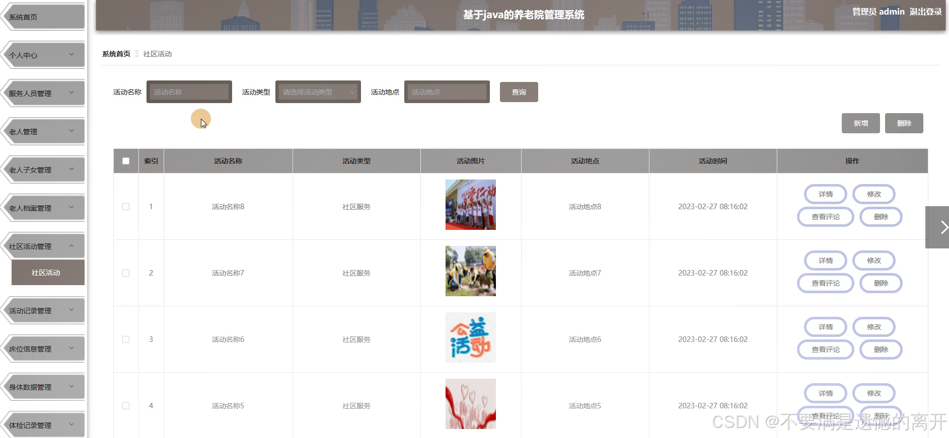 管理员点击社区活动管理,在社区活动管理页面中可以对活动名称、活动类型、活动图片、活动地点、活动时间等信息,并可根据需要进行查询、新增或者删除社区活动等操作,如图5-11所示。