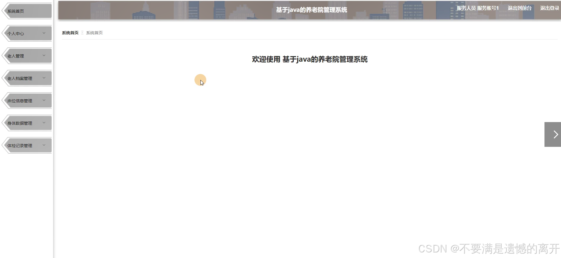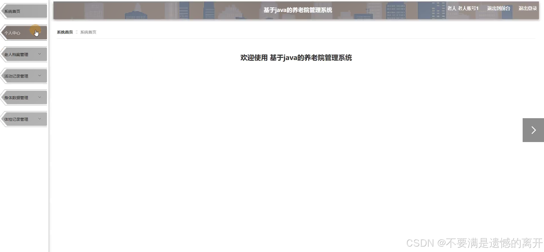 服务人员点击后台管理,然后页面跳转到养老院管理系统可以查看系统首页、个人中心、老人管理、老人档案管理、床位信息管理、身体数据管理、体检记录管理等内容,如图5-15所示。