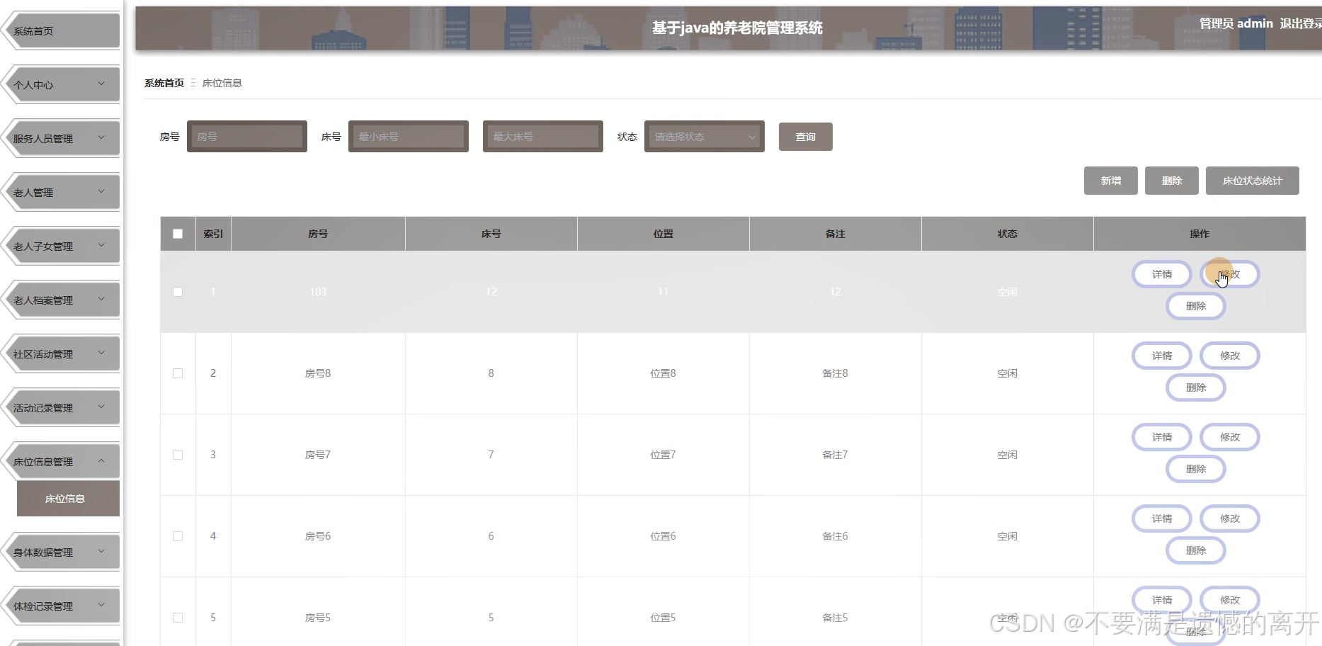 管理员点击床位信息管理,在床位信息管理页面中可以对房号、床号、位置、备注、状态 等信息,并可根据需要进行查询、新增或者删除床位信息等操作,如图5-12所示。