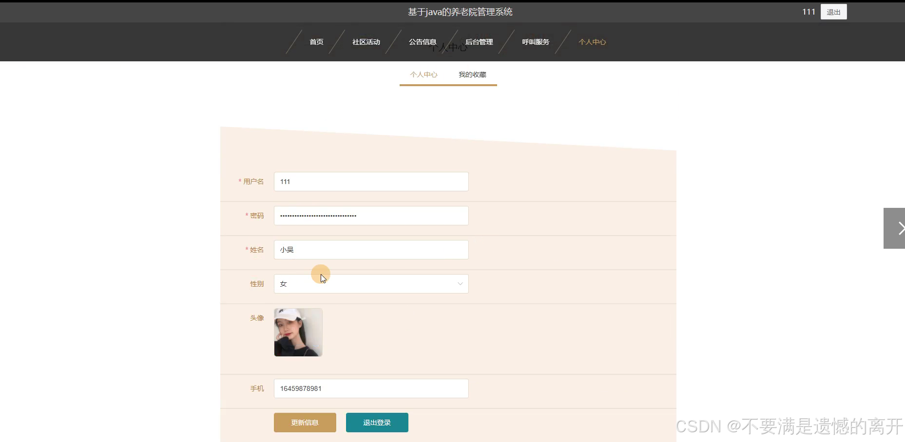 在个人中心页面可以输入个人详细信息,进行信息更新操作,还可以对我的收藏进行详细操作,如图5-4所示: