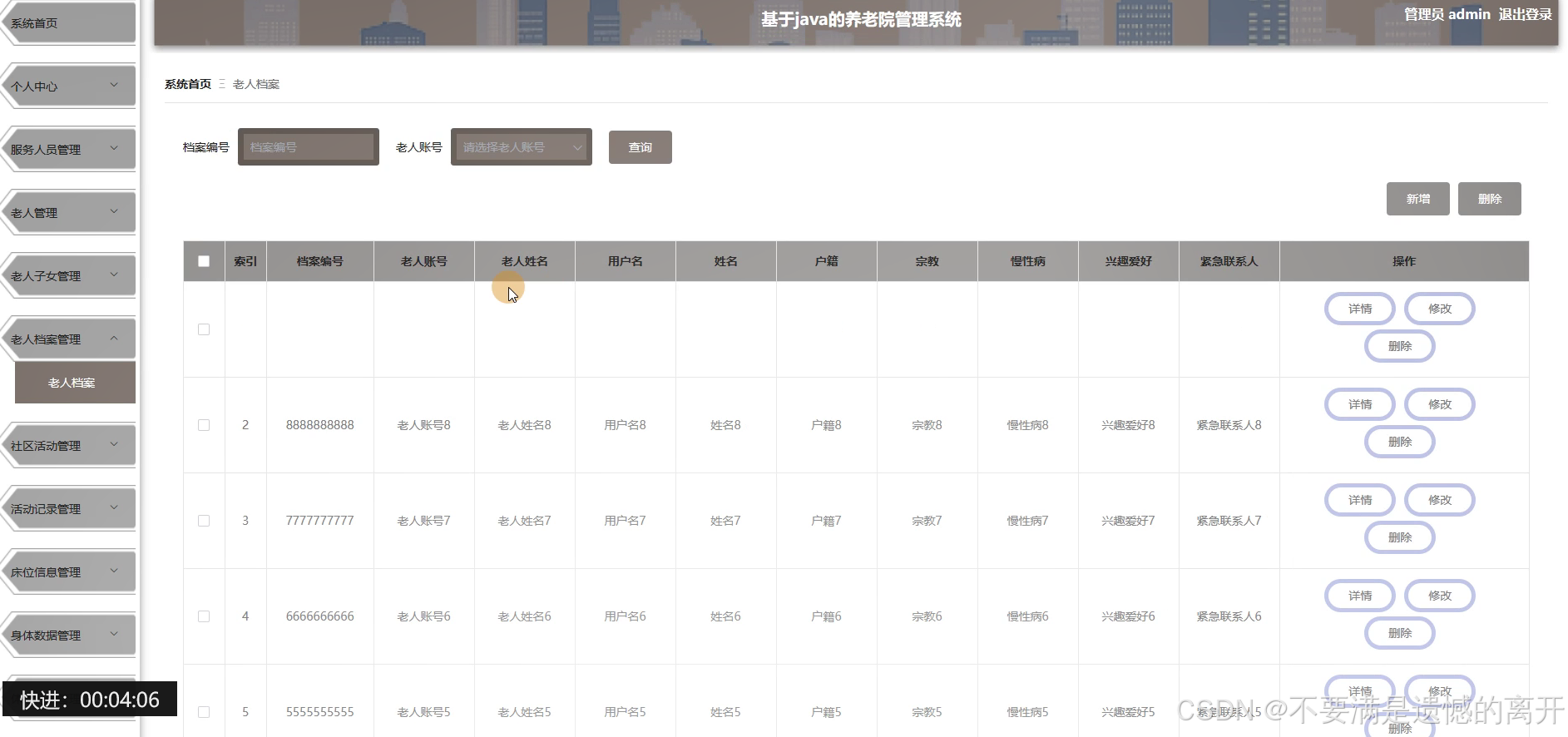 管理员点击老人档案管理,在老人档案管理页面中可以对档案编号、老人账号、老人姓名、用户名、姓名、户籍、宗教、慢性病、兴趣爱好、紧急联系人等信息,并可根据需要进行查询、新增或者删除老人档案等操作,如图5-10所示。