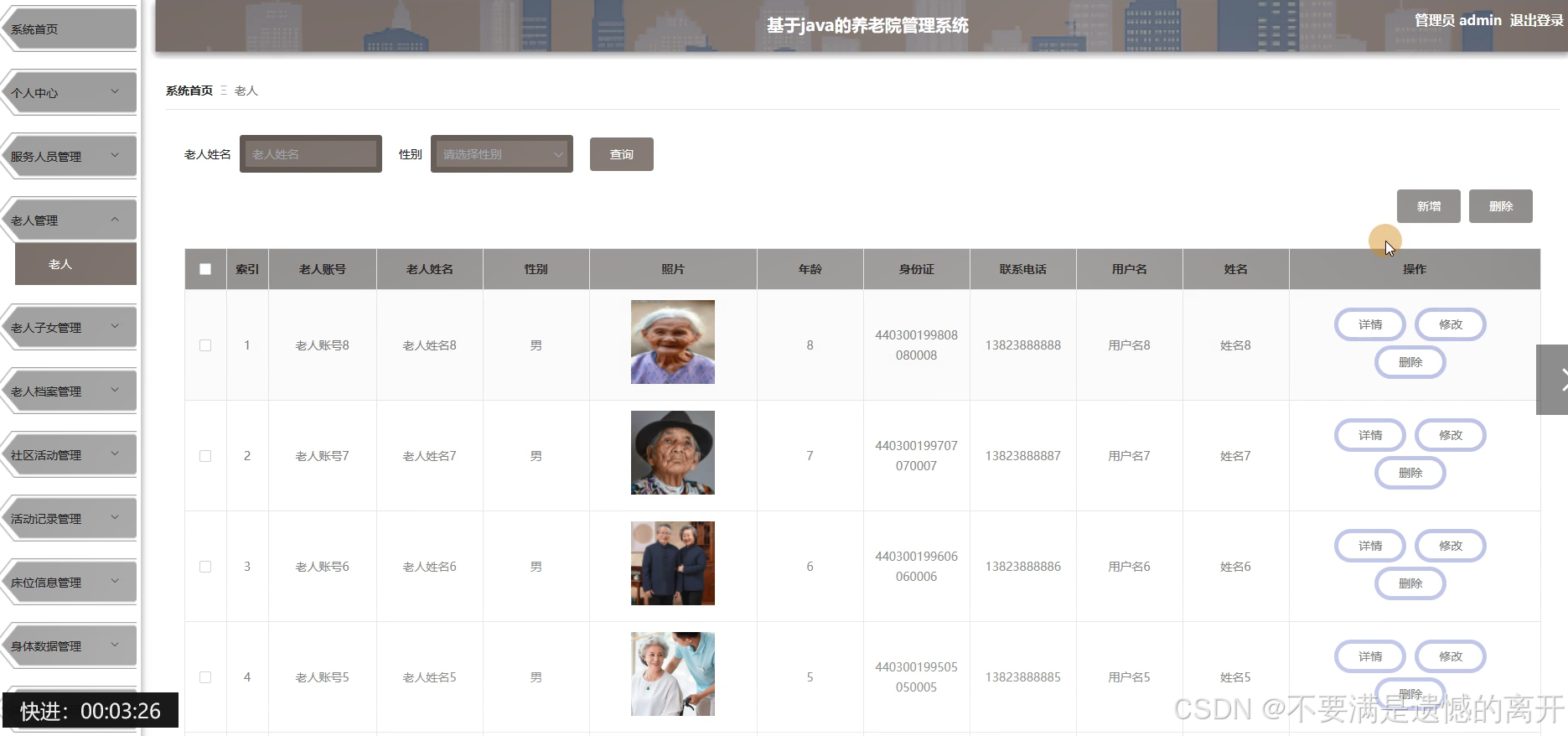 管理员点击老人管理,在老人管理页面中可以对老人账号、老人姓名、性别、照片、年龄、身份证、联系电话、用户名、姓名等信息,并可根据需要进行查询或者新增、删除老人信息等操作,如图5-8所示。