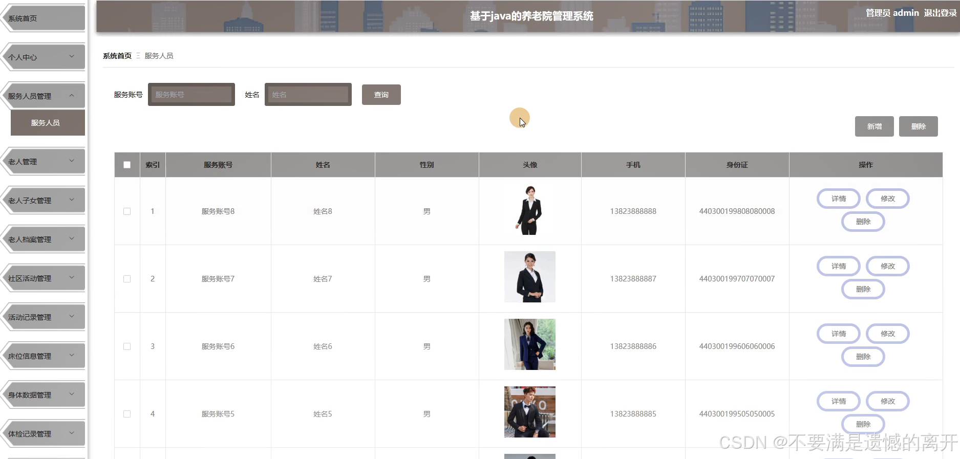 管理员点击服务人员管理,在服务人员管理页面中可以对服务账号、姓名、性别、头像、手机、身份证等信息,并可根据需要进行查询或者新增、删除服务人员信息等操作,如图5-7所示。
