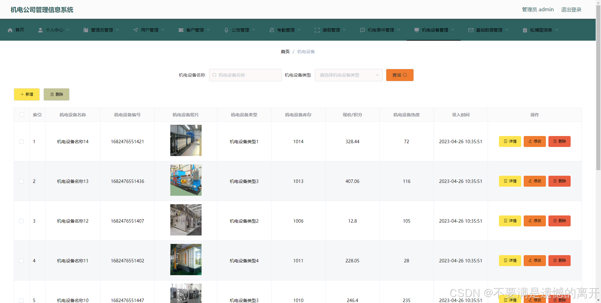 图5.1 即为编码实现的机电设备管理界面,管理员在机电设备管理界面中可以对界面中显示,可以对机电设备信息的机电设备状态进行查看,可以添加新的机电设备信息等。