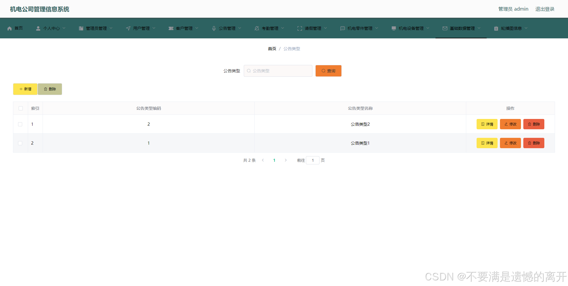 图5.4 即为编码实现的公告类型管理界面,管理员在公告类型管理界面查看公告的工作状态,可以对公告的数据进行导出,可以添加新公告的信息,可以编辑公告信息,删除公告信息。
