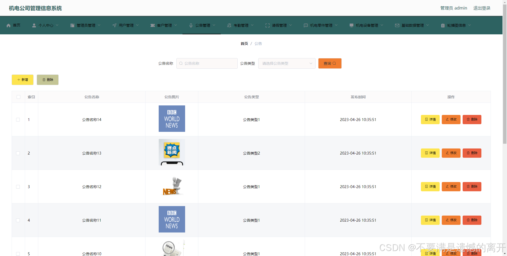 图5.3 即为编码实现的公告管理界面,管理员在公告管理界面中新增公告,可以删除公告。