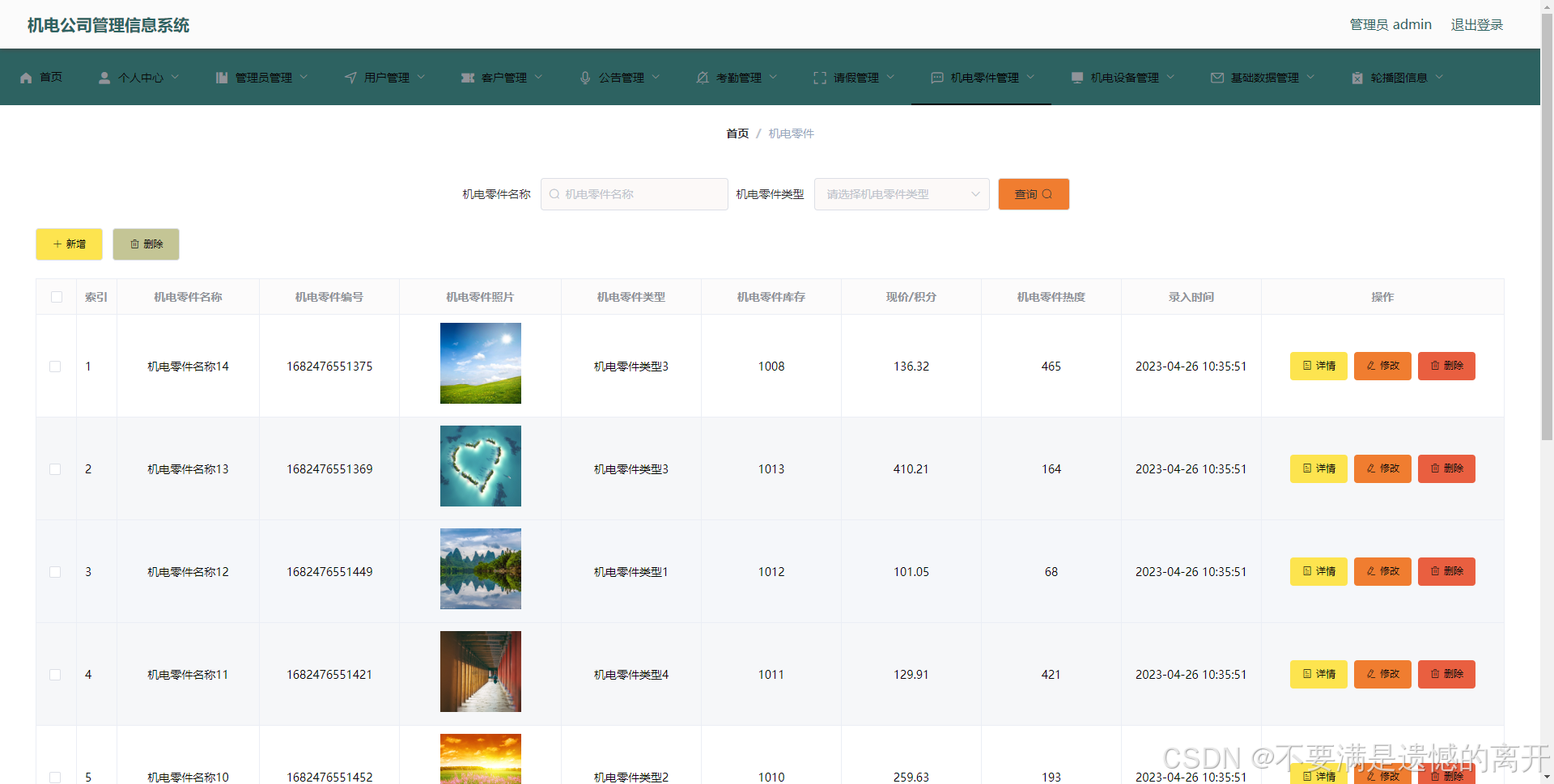图5.2 即为编码实现的机电零件管理界面,管理员在机电零件管理界面中查看机电零件种类信息,机电零件描述信息,新增机电零件信息等。