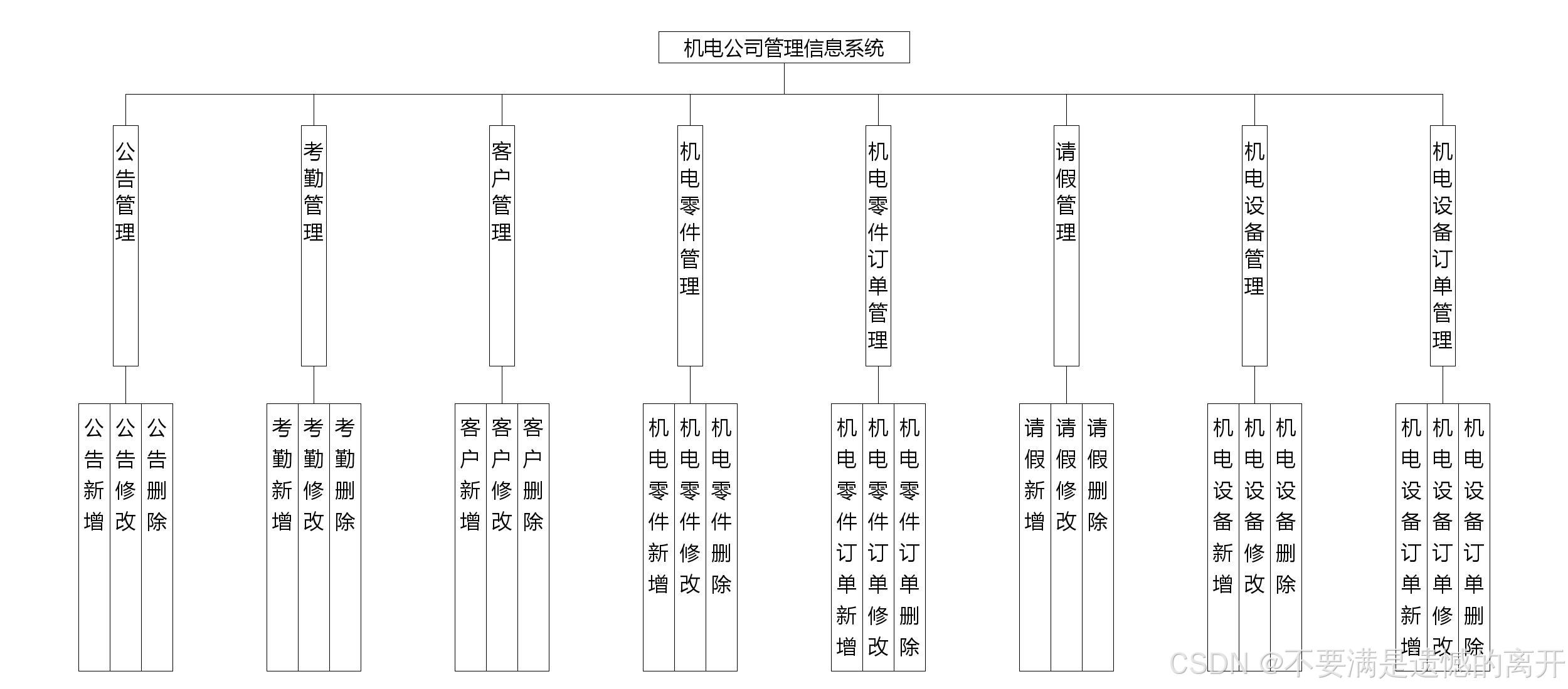 图4.1即为设计的管理员功能结构,管理员权限操作的功能包括管理公告,管理机电公司管理信息系统信息,包括机电设备管理,培训管理,机电零件管理,薪资管理等,可以管理公告。