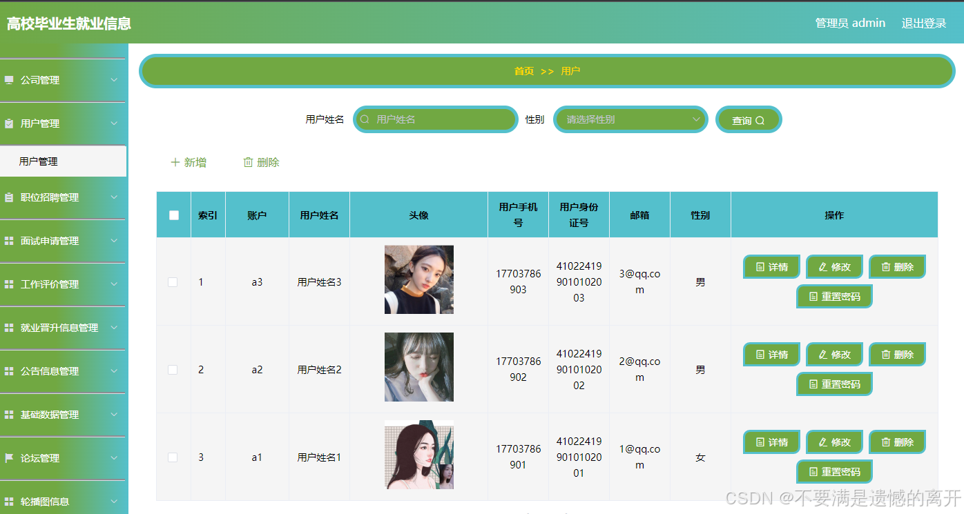 如图5.1显示的就是用户信息管理页面,此页面提供给管理员的功能有:用户信息的查询管理,可以删除用户信息、修改用户信息、新增用户信息,还进行了对用户名称的模糊查询的条件