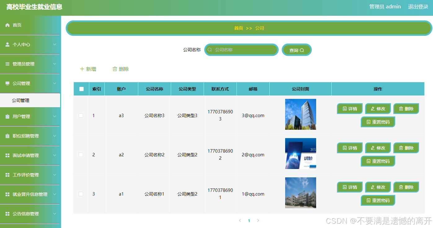 如图5.3显示的就是公司信息管理页面,此页面提供给管理员的功能有:根据公司信息进行条件查询,还可以对公司信息进行新增、修改、查询操作等等。