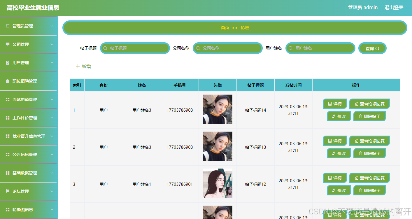 如图5.4显示的就是论坛信息管理页面,此页面提供给管理员的功能有:根据论坛信息进行新增、修改、查询操作等等。