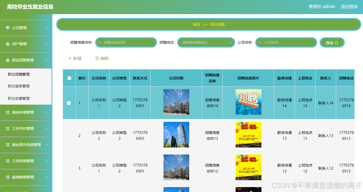 如图5.2显示的就是职位招聘管理页面,此页面提供给管理员的功能有:查看已发布的职位招聘数据,修改职位招聘,职位招聘作废,即可删除,还进行了对职位招聘名称的模糊查询 职位招聘信息的类型查询等等一些条件。