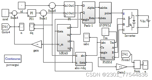 PMSM永磁同步电机模型参考自适应法MRAS,MATLAB SIMULINK仿真软件,无速度传感器矢量控制,可以实现变转速控制,PI已调好。