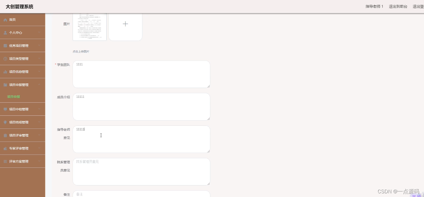本大创管理系统有院系管理员,指导老师以及学生三个角色。学生功能有优秀项目,项目信息,评审方案,大创资讯,项目申报管理,项目中检管理,项目结项管理,项目评审管理,专家评审管理。指导老师功能有个人中心,优秀项目管理,项目类型管理,项目信息管理,项目申报管理,项目中检管理,项目结项管理,项目评审管理,专家评审管理,评审方案管理。院系管理员功能有个人中心,优秀项目管理,项目类型管理,项目信息管理,项目申报管理,项目中检管理,项目结项管理,项目评审管理,专家评审管理,评审方案管理。因而具有一定的实用性。