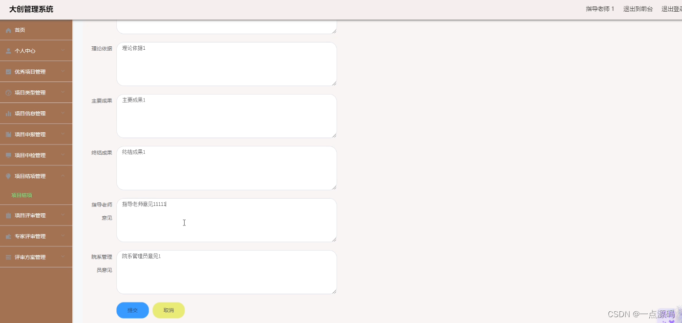 指导老师可以对项目结项信息进行修改操作,还可以对项目结项信息进行查询。界面如下图所示: