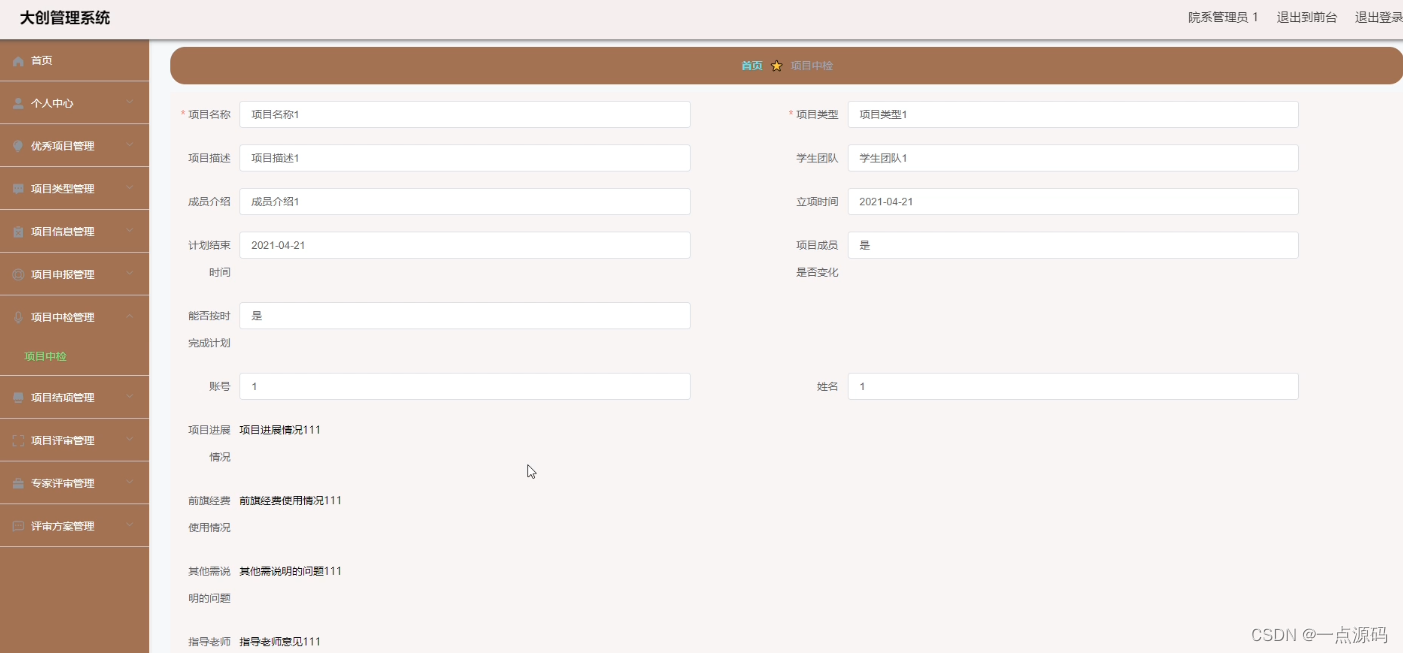 大创管理系统的系统管理员可以管理项目中检,可以对项目中检信息添加修改删除以及查询操作。具体界面的展示如图5.1所示。