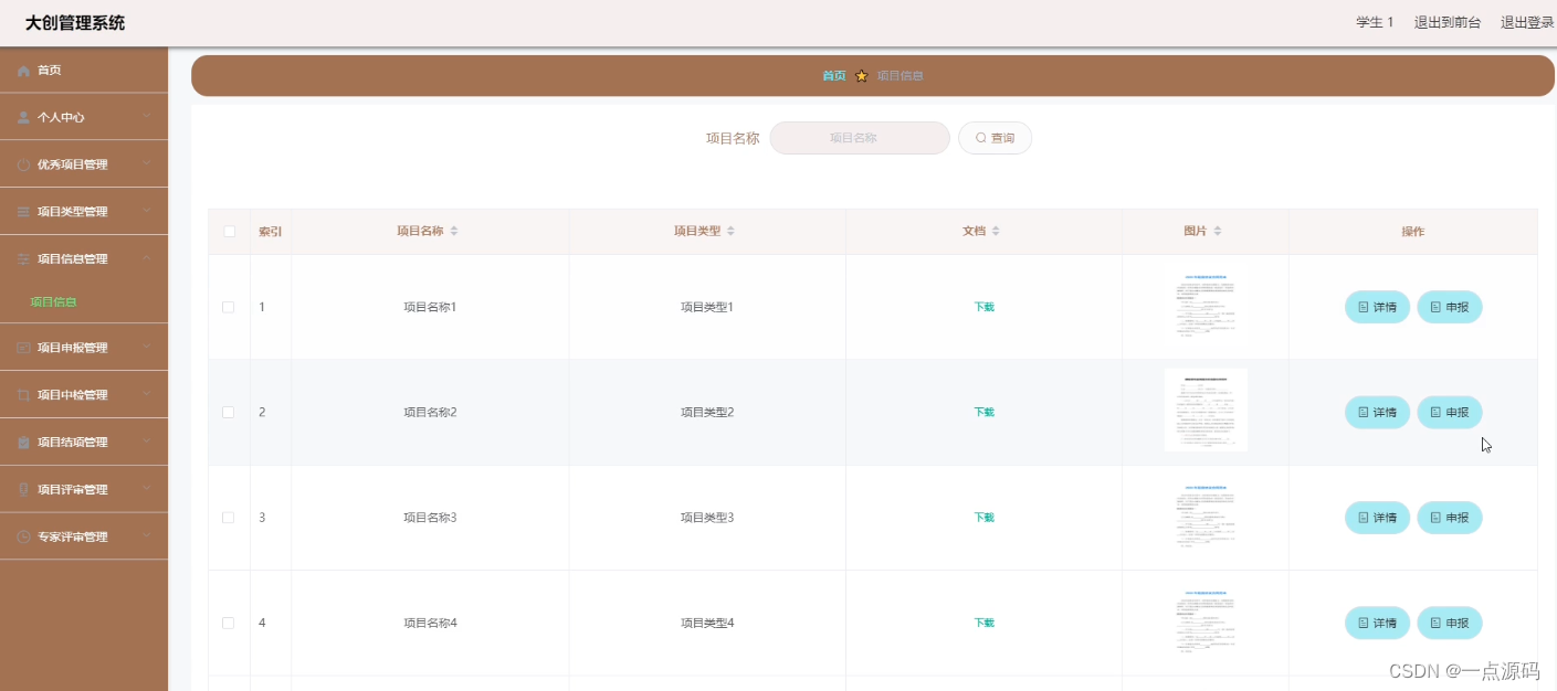 学生登录后在个人中心项目信息管理里面可以点击项目申报。界面如下图所示: