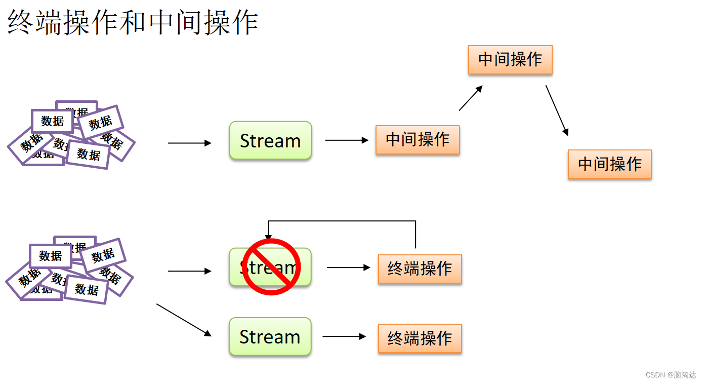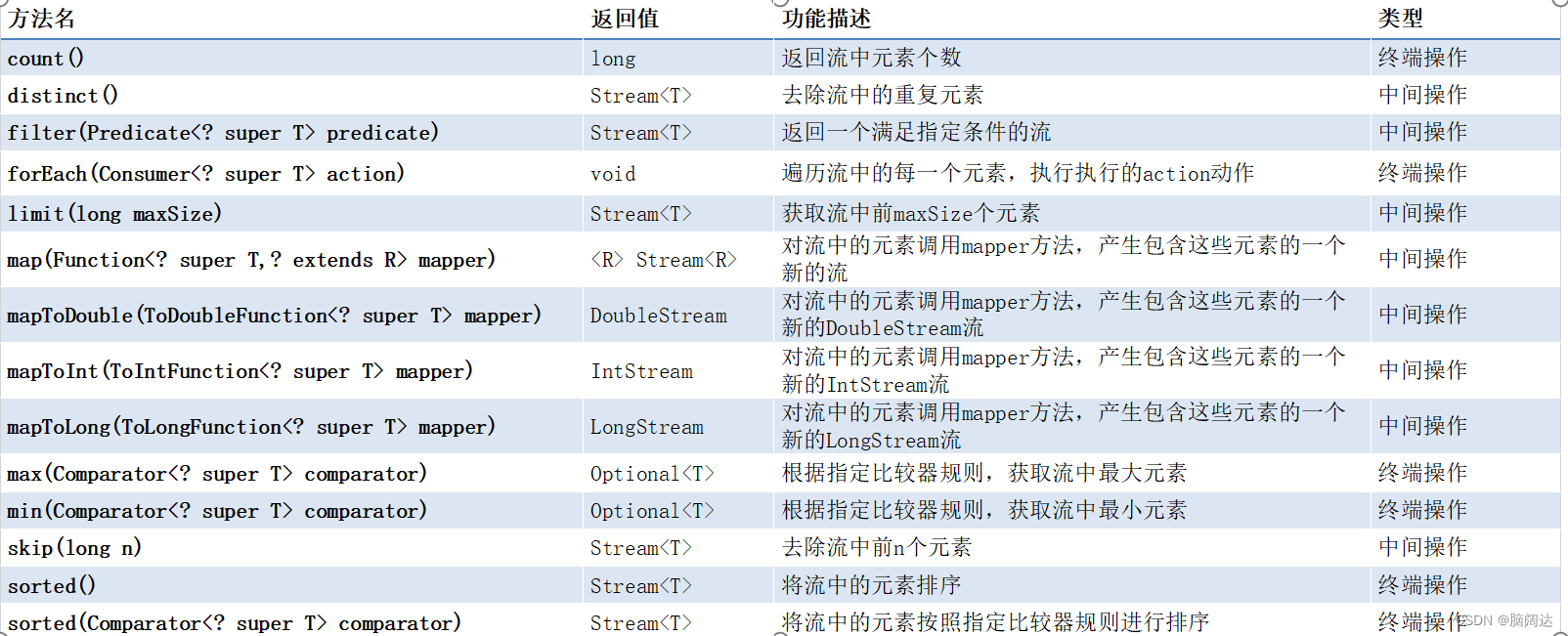 中间操作和终端操作。中间操作类型的方法会生成一个新的流对象,被操作的流对象仍然可以执行其他操作;终端操作会消费流,操作结束之后,被操作的流对象就不能再次执行其他操作了。这是两者的最大区别。