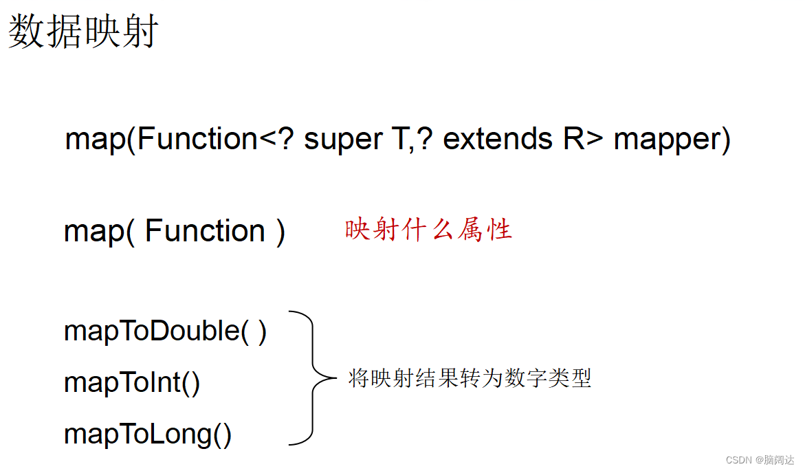 数据的映射和过滤概念不同:过滤是在流中找到符合条件的元素,映射是在流中获得具体的数量Stream接口提供了map()方法用来实现数据映射,map()方法会按照参数中的函数逻辑获取新的对象,新的流对象中元素类型可能与旧流对象元素类型不相同。
