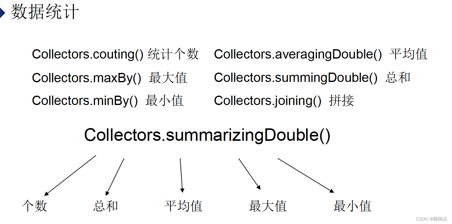 collectors类为收集器类,该类实现了java.util.Colleetor接口,可以将Stream流对象进行各种各样的封装、归集、分组等操作。同时,Collectors类还提供了很多实用的数据加工方法,如数据统计计算等.