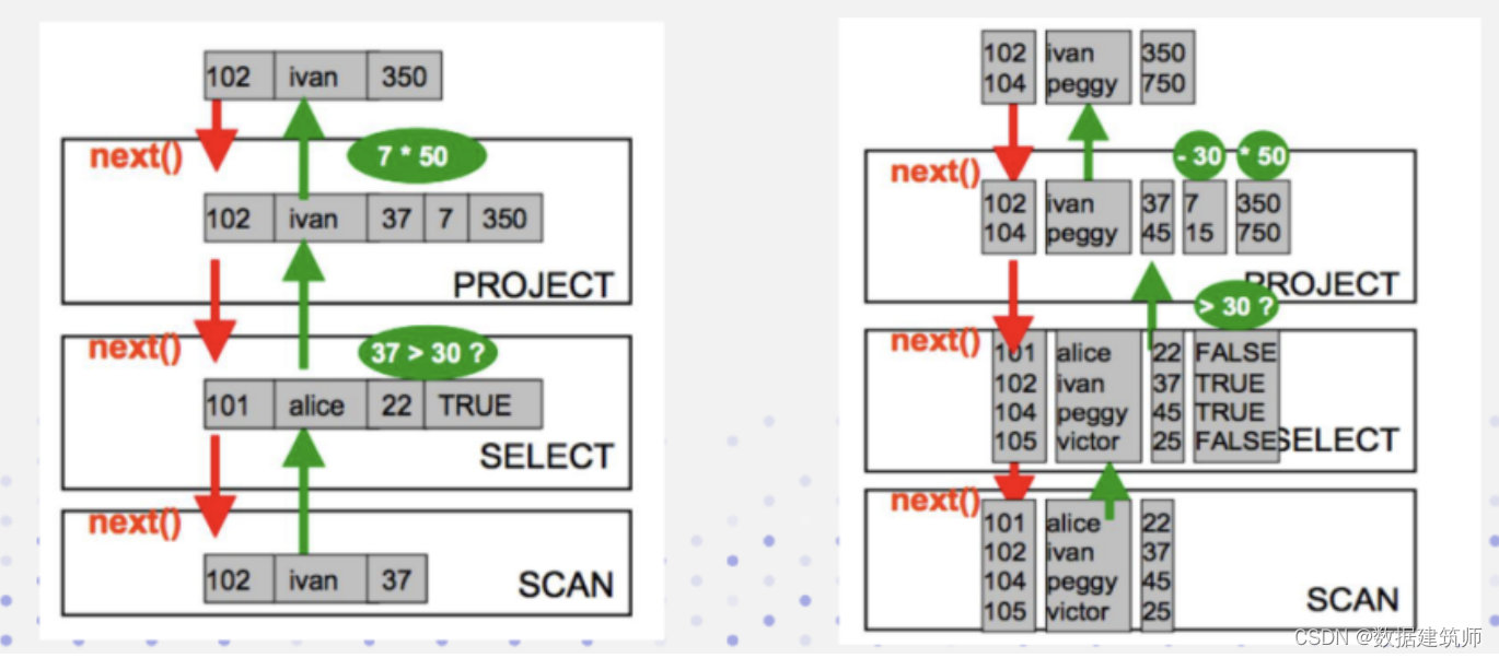 以doris公众号上描述的doris的例子,左边是火山模型的执行示意图,右边是向量化的执行示意图。