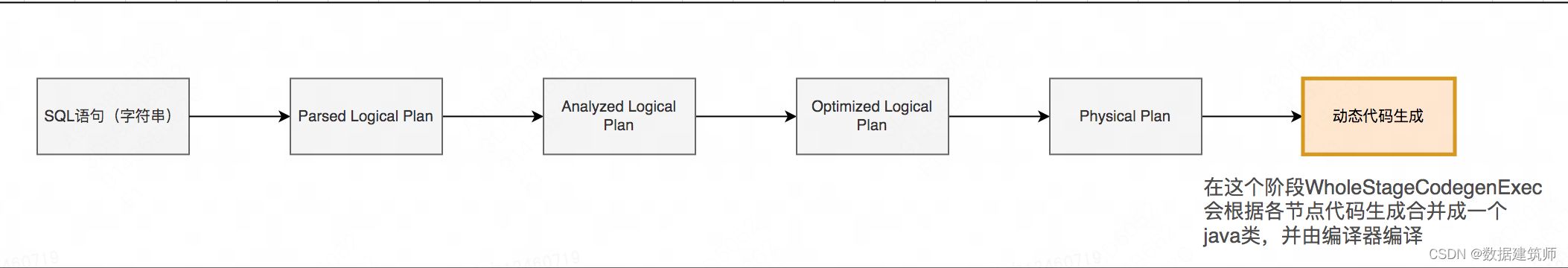 以sparkSQL为例(其余计算引擎也类似),一条sql在执行前经过了以下几个过程,在物理执行计划之后额外的进行动态代码生成并替换掉原先的火山模型执行代码。