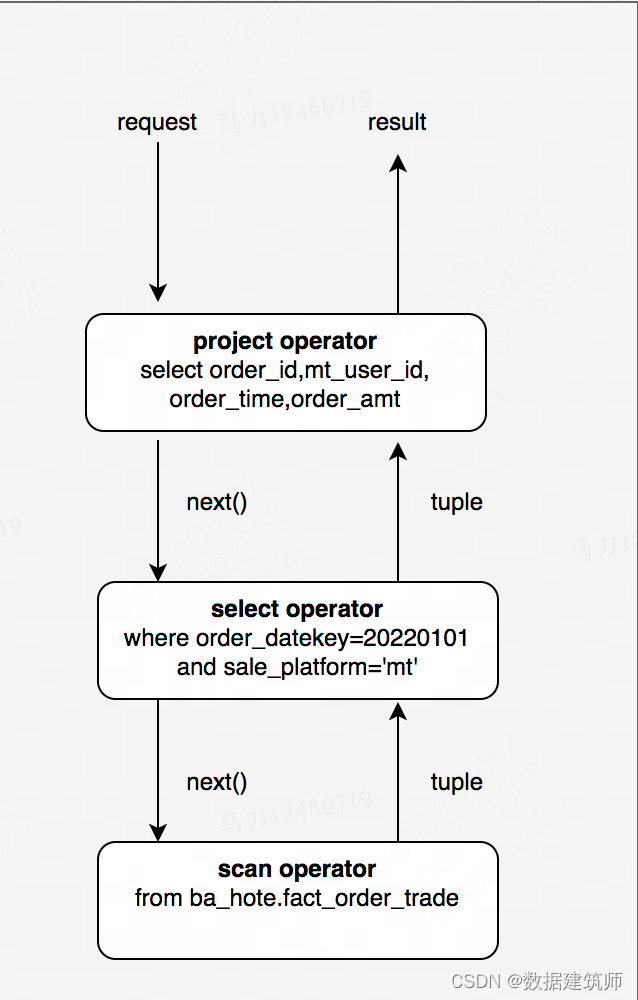 火山模型(Volcano-style execution)是最早的查询执行引擎,也叫做迭代模型 (iterator model),这个模型的特点是一次只处理一行(tuple)数据。在这种模型中,查询计划是一个由operator组成的DAG,其中每一个operator 包含三个函数:open,next,close。Open 用于申请资源,比如分配内存,打开文件,close 用于释放资源,next方法递归的调用子operator的 next方法。