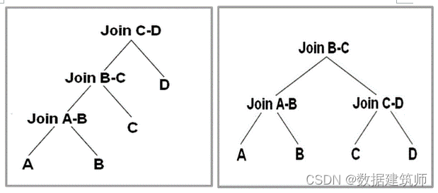 一个好的CBO应该能够根据SQL 语句的特点,来自动选择使用Left-deep tree(LDT,左图)还是 bushy tree(BYT,右图)执行join。