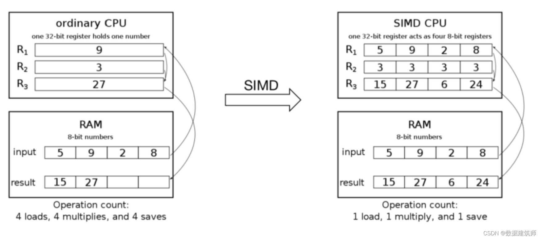 下图以计算数据*3为例讲述SIMD下的计算过程比传统CPU指令要快
