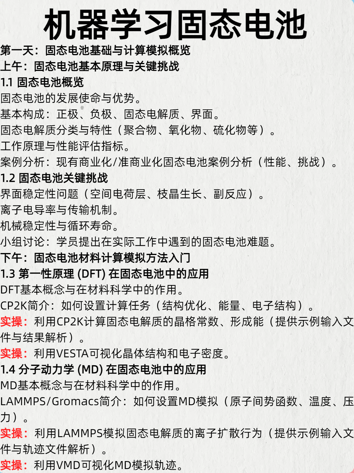 2. 了解利用第一性原理(DFT)和分子动力学(MD)及其相关工具(如VASP, CP2K, LAMMPS, Gromacs)计算固态电池关键材料(电极、电解质)及界面性质的基本方法。