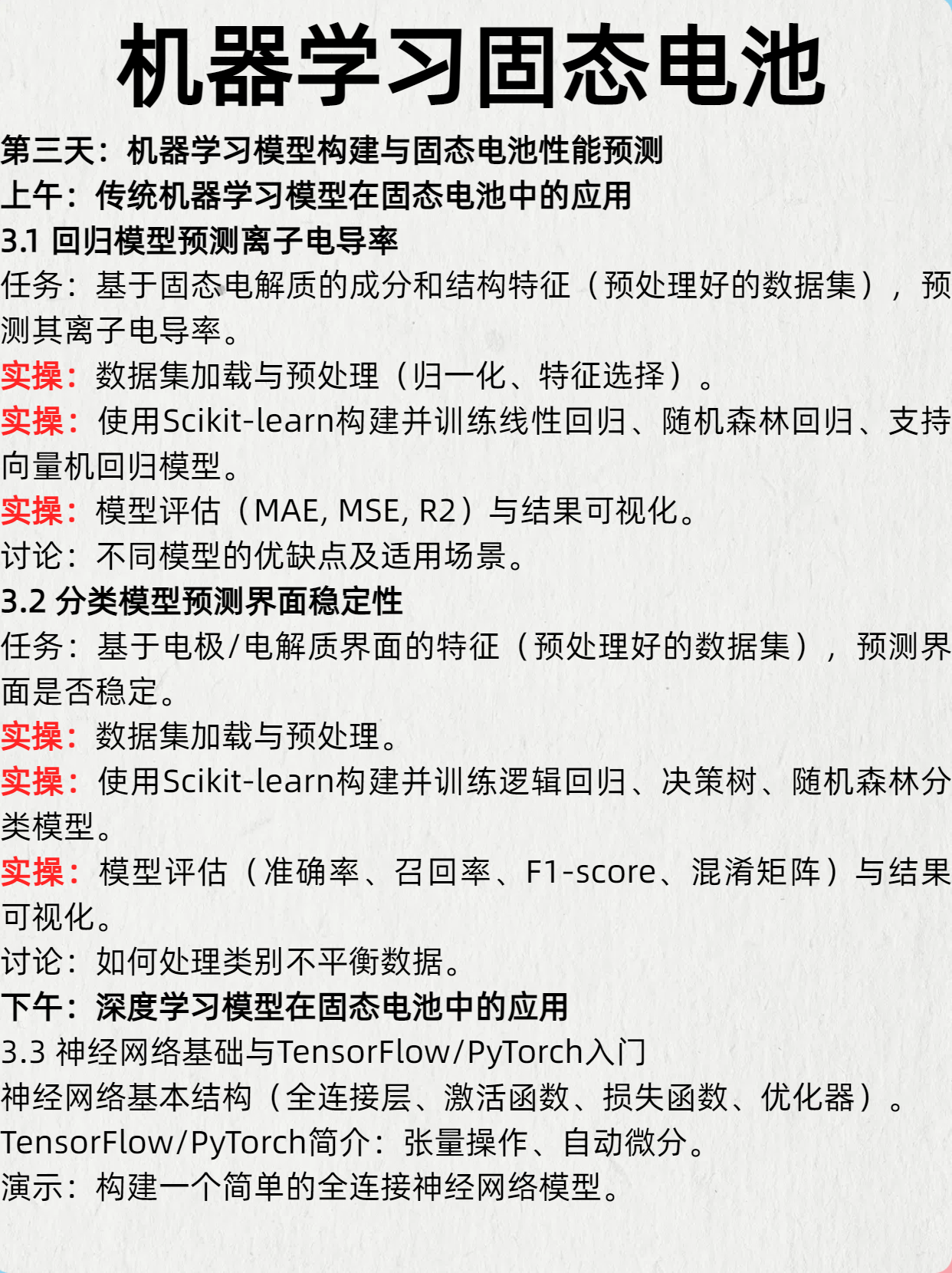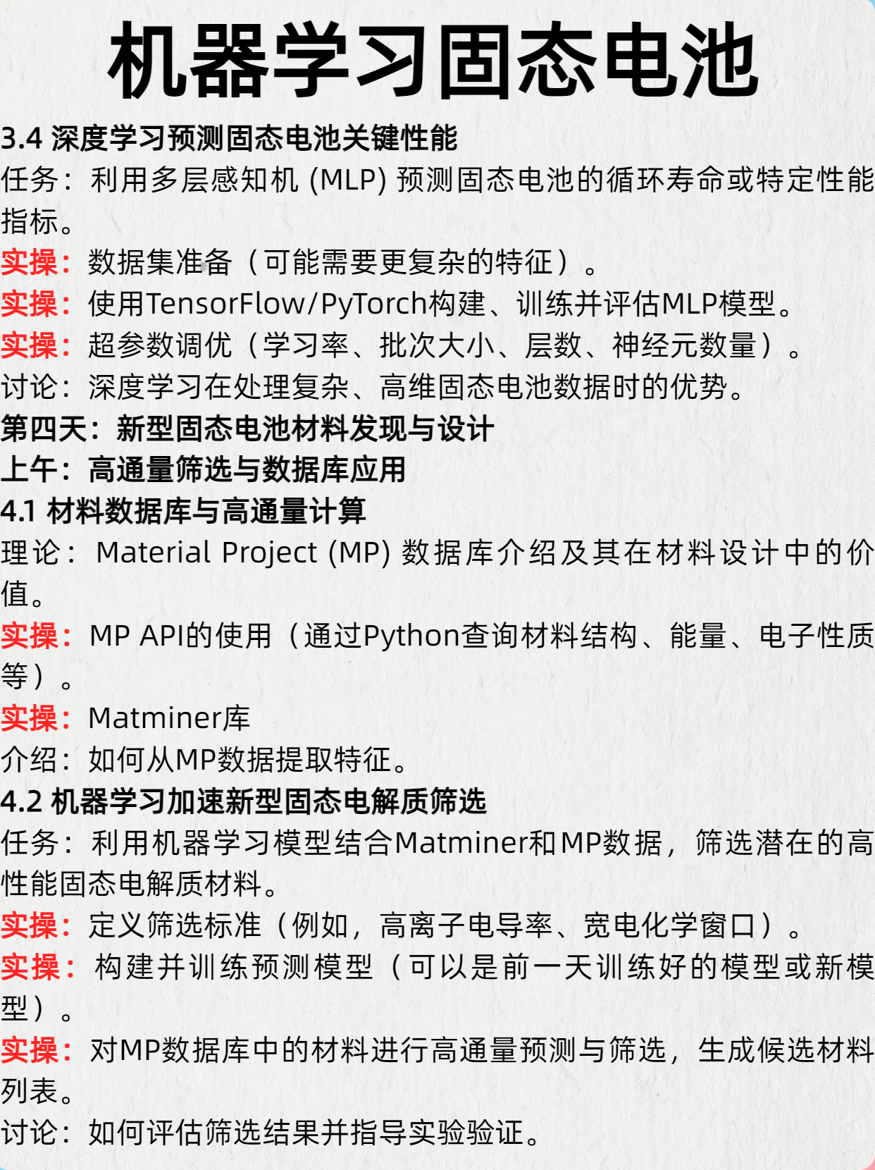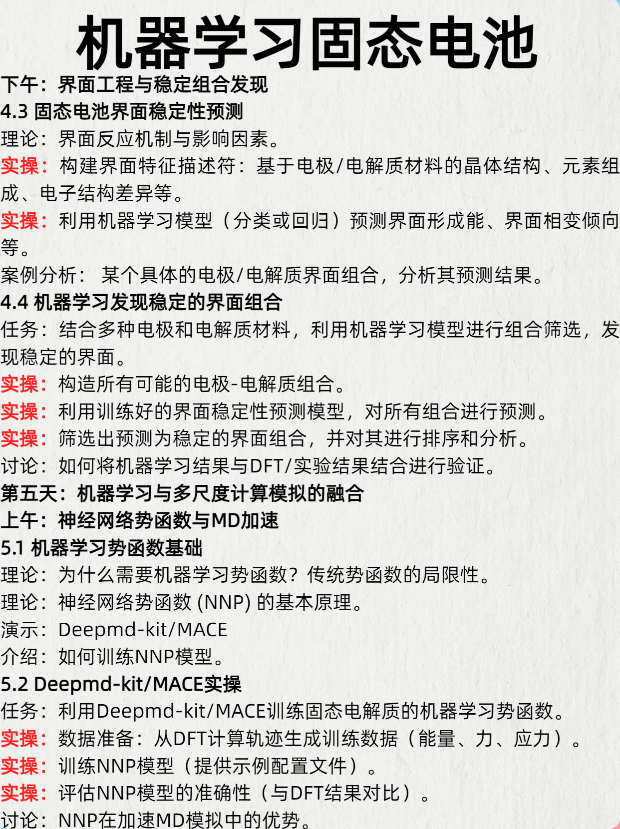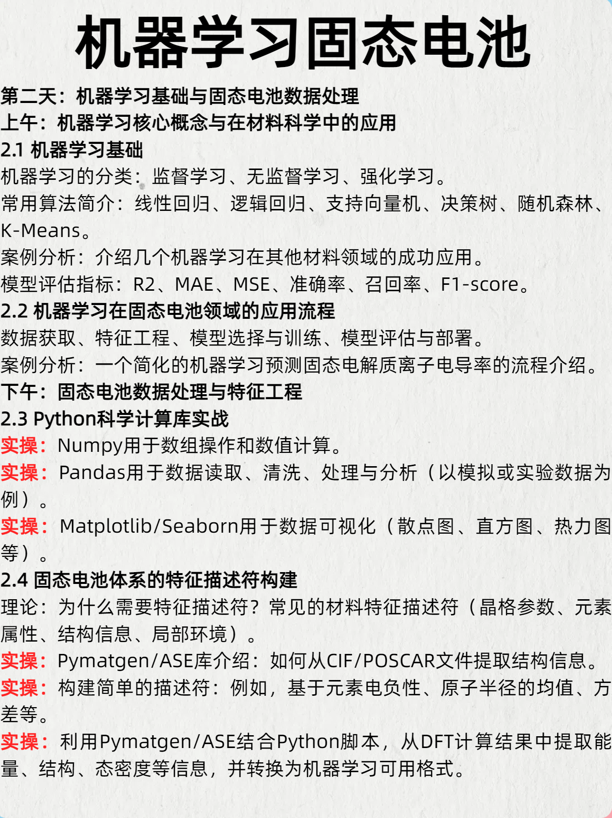 3. 掌握机器学习的基本概念、常用算法及其在材料科学,特别是固态电池领域的应用流程。