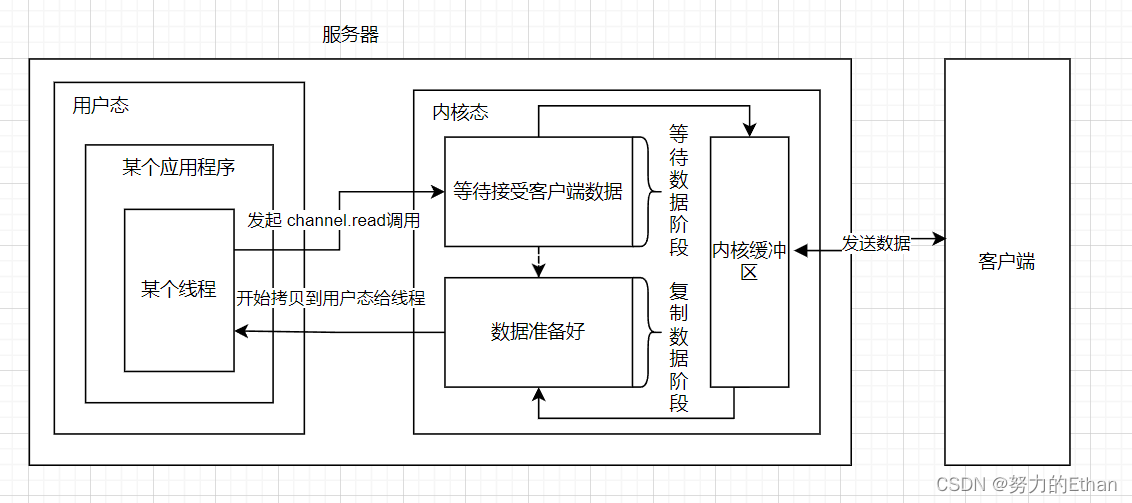 Java 中常见 IO 模型 典型 Java 服务端处理网络请求的 IO 过程:应用程序再用户态,不能直接访问内核空间,若想进行如文件管理、进程通信、内存管理、外界客户端通信等 IO 操作时,需要发起 I/O 调用,由操作系统的内核代为完成操作系统通过网卡,读取客户端的请求数据到内核缓冲区。内核再将数据从内核缓冲区拷贝到 Java 进程缓冲区。Java 进程处理完请求数据后把构建好的响应从用户缓冲区写入内核缓冲区。内核再通过网络 I/O ,将内核缓冲区中的数据,写入网卡,网卡通过底层的通讯协议,将响应数据发送给目标客户端。